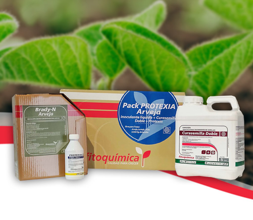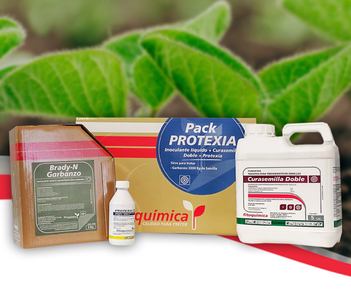 Composición: Es un pack ideado para un completo tratamiento de semillas que combina la acción de CURASEMILLA DOBLE (Tiram + Carbendazim), PROTEXIA FS (Metalaxil) Y BRADY-N GARBANZO (Inoculante).